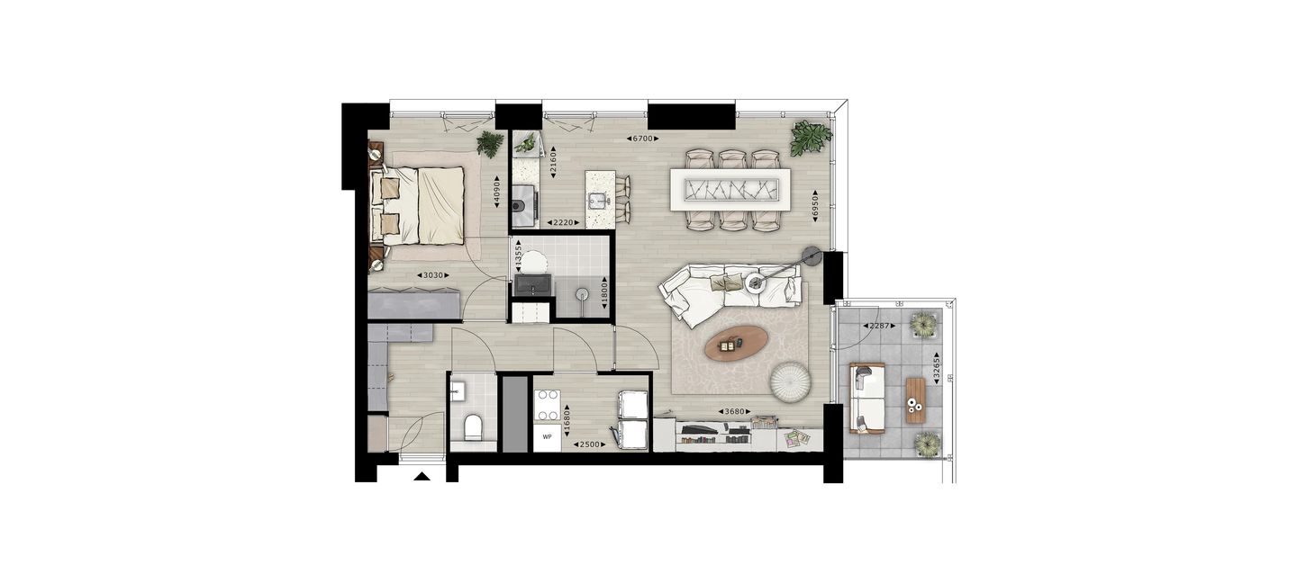 Een heerlijk speels appartement met veel lichtinval, een slaapkamer, balkon en berging. De keuken, badkamer, PVC-vloer in kleuren naar keuze en wandafwerking zijn allemaal geregeld als je de sleutel krijgt. En uiteraard zijn de appartementen van type Bushwick voorzien van vloerverwarming en -koeling, volledig geïsoleerd en heb je je eigen hardloopbaan op het dak!