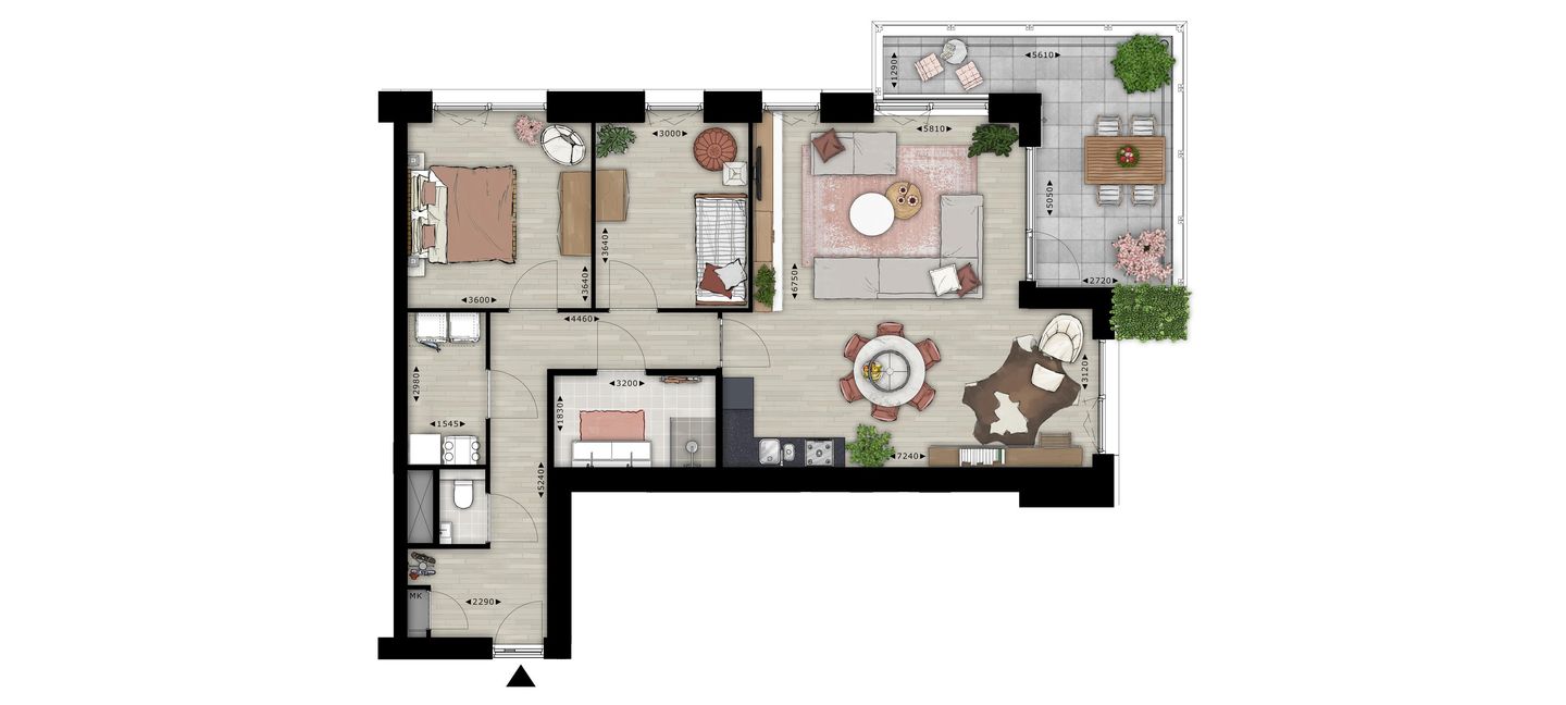 Queens type E3-kamer hoekappartement dat te vinden is op de eerste, tweede, derde en vierde verdieping met ruim hoekbalkon op het zuidwesten.