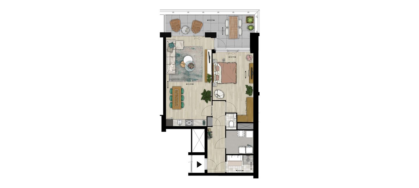 Een heerlijk licht 2-kamer appartement met een slaapkamer en ruime berging. De keuken, badkamer, PVC-vloer in kleuren naar keuze en wandafwerking zijn allemaal geregeld als je de sleutel krijgt. En uiteraard zijn de appartementen van type Tribeca voorzien van vloerverwarming en -koeling, volledig geïsoleerd en heb je je eigen hardloopbaan op het dak!